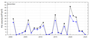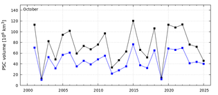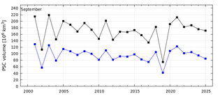 Monthly average PSC volumes .PSC type 1 black PSC type 2 blue